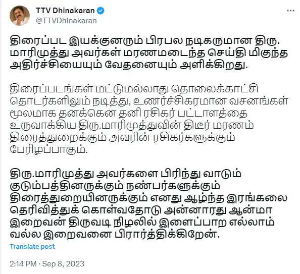 நடிகர் மாரிமுத்து மறைவுக்கு தினகரன் இரங்கல் தெரிவித்துள்ளார்.