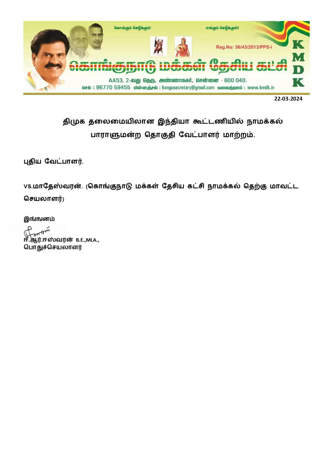 வரும் நாடாளுமன்றத் தேர்தலில் திமுக கூட்டணியில் அங்கம் வகிக்கும் கொங்குநாடு மக்கள் தேசிய கட்சிக்கு நாமக்கல் தொகுதி ஒதுக்கப்பட்டிருந்தது.