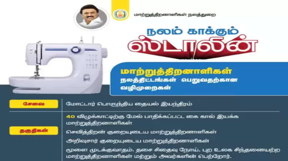 தற்போது மாற்றுத்திறனாளிகள் நலத்துறை சார்பில் நலம் காக்கும் ஸ்டாலின் திட்டத்தின் கீழ் மோட்டார் பொருந்திய தையல் இயந்திரம் இலவசமாக வழங்கப்படுகிறது. இந்த தையல் இயந்திரமானது மாற்றுத்திறனாளிகளுக்கு சுயதொழில் வாய்ப்புகளை உருவாக்குவது மற்றும் அவர்களின் வாழ்வாதாரத்தை மேம்படுத்தும் வகையில் செயல்படுத்தப்படுகிறது.