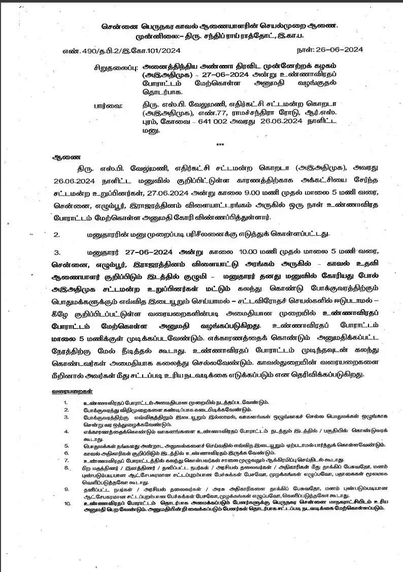 மனுதாரர் 27-06-2024 அன்று காலை 10.00 மணி முதல் மாலை 5 மணி வரை, சென்னை, எழும்பூர், இராஜரத்தினம் விளையாட்டு அரங்கம் அருகில் - காவல் உதவி ஆணையாளர் குறிப்பிடும் இடத்தில் குழுமி - மனுதாரர் தனது மனுவில் கோரியது போல் அஇஅதிமுக சட்டமன்ற உறுப்பினர்கள் மட்டும் கலந்து கொண்டு போக்குவரத்திற்கும் பொதுமக்களுக்கும் எவ்வித இடையூறும் செய்யாமல் - சட்டவிரோதச் செயல்களில் ஈடுபடாமல் - கீழே குறிப்பிடப்பட்டுள்ள வரையறைகளின்படி அமைதியான முறையில் உண்ணாவிரதப் போராட்டம் மேற்கொள்ள அனுமதி வழங்கப்படுகிறது. உண்ணாவிரதப் போராட்டம் மாலை 5 மணிக்குள் முடிக்கப்படவேண்டும். எக்காரணத்தைக் கொண்டும் அனுமதிக்கப்பட்ட நேரத்திற்கு மேல் நீடித்தல் கூடாது. உண்ணாவிரதப் போராட்டம் முடிந்தவுடன் கலந்து கொண்டவர்கள் அமைதியாக கலைந்து செல்லவேண்டும். காவல்துறையின் வரையறைகளை மீறினால் அவர்கள் மீது சட்டப்படி உரிய நடவடிக்கை எடுக்கப்படும் என தெரிவிக்கப்படுகிறது என்று குறிப்பிட்டுள்ளது.