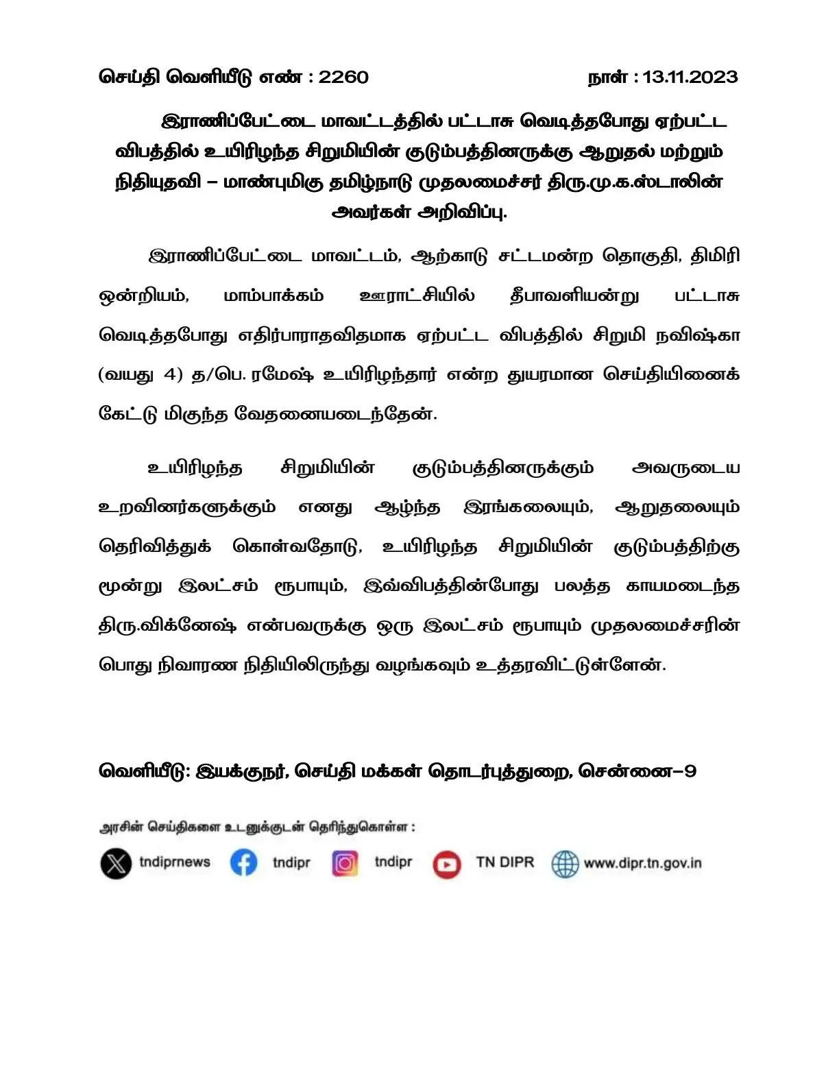 இராணிப்பேட்டை மாவட்டத்தில் பட்டாசு வெடித்தபோது ஏற்பட்ட விபத்தில் உயிரிழந்த சிறுமியின் குடும்பத்தினருக்கு முதலமைச்சர் மு.க.ஸ்டாலின் நிதியுதவி அறிவித்துள்ளார்.