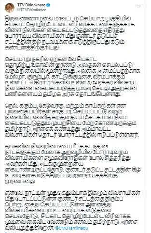 விவசாயிகள் மீது போடப்பட்டுள்ள குண்டர் சட்டத்தை திரும்ப பெற வேண்டும் என்று தினகரன் வலியுறுத்தியுள்ளார்.