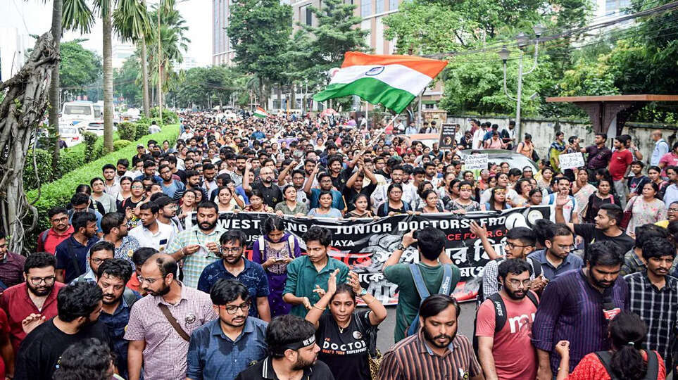 பாலியல் கொலை செய்யப்பட்ட முதுநிலை பெண் பயிற்சி மருத்துவருக்கு நீதி கேட்டும், மாநில சுகாதாரத் துறையின் ஊழலுக்கு முடிவு கட்ட கோரியும் இளநிலை மருத்துவா்கள் காலவரையற்ற உண்ணாவிரதப் போராட்டம் நடத்தி வருகின்றனர். கடந்த புதன்கிழமை மாநில அரசு சாா்பில் மருத்துவா்களுடன் நடத்தப்பட்ட பேச்சுவாா்த்தை தோல்வியடைந்ததையடுத்து பல்வேறு மருத்துவக் கல்லூரிகளைச் சோ்ந்த இளநிலை மருத்துவா்கள் இந்தப் போராட்டத்தில் தொடா்ந்து ஈடுபட்டு வருகின்றனா்.