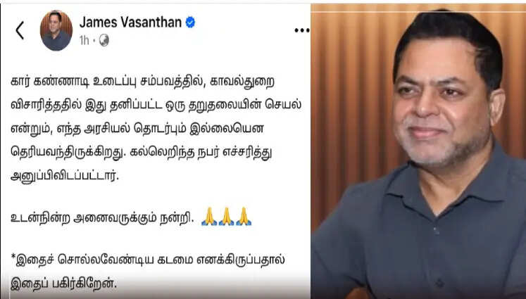 இந்நிலையில் இசையமைப்பாளர் ஜேம்ஸ் வசந்தனின் தனது சமூக வலைத்தள பக்கத்தில், "கார் கண்ணாடி உடைப்பு சம்பவத்தில், காவல்துறை விசாரித்ததில் இது தனிப்பட்ட ஒரு தறுதலையின் செயல் என்றும், எந்த அரசியல் தொடர்பும் இல்லையென தெரியவந்திருக்கிறது, கல்லெறிந்த நபர் எச்சரித்து அனுப்பிவிடப்பட்டார். உடன்நின்ற அனைவருக்கும் நன்றி. இதைச் சொல்லவேண்டிய கடமை எனக்கிருப்பதால் இதைப் பகிர்கிறேன்" எனக் குறிப்பிட்டுள்ளார்.