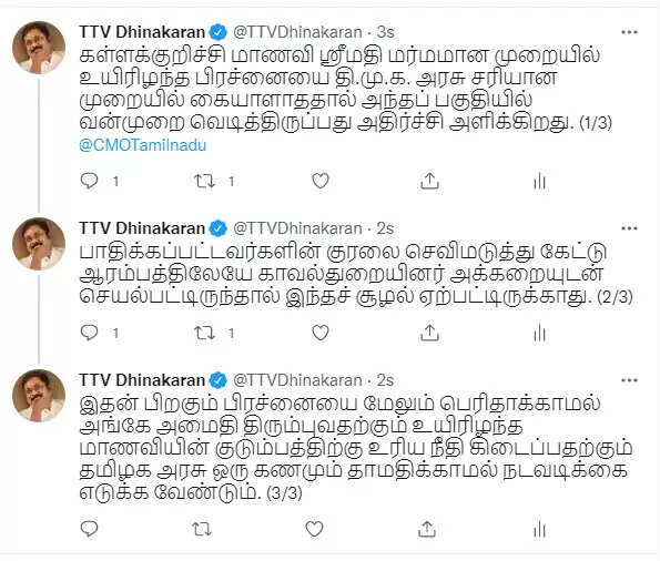 இந்நிலையில் அம்மா மக்கள் முன்னேற்ற கழகம் பொதுச்செயலாளர் டிடிவி தினகரன் தனது ட்விட்டர் பக்கத்தில், "கள்ளக்குறிச்சி மாணவி ஸ்ரீமதி மர்மமான முறையில் உயிரிழந்த பிரச்னையை தி.மு.க. அரசு சரியான முறையில் கையாளாததால் அந்தப் பகுதியில் வன்முறை வெடித்திருப்பது அதிர்ச்சி அளிக்கிறது. பாதிக்கப்பட்டவர்களின் குரலை செவிமடுத்து கேட்டு ஆரம்பத்திலேயே காவல்துறையினர் அக்கறையுடன் செயல்பட்டிருந்தால் இந்தச் சூழல் ஏற்பட்டிருக்காது. இதன் பிறகும் பிரச்னையை மேலும் பெரிதாக்காமல் அங்கே அமைதி திரும்புவதற்கும் உயிரிழந்த மாணவியின் குடும்பத்திற்கு உரிய நீதி கிடைப்பதற்கும் தமிழக அரசு ஒரு கணமும் தாமதிக்காமல் நடவடிக்கை எடுக்க வேண்டும்" என்று பதிவிட்டுள்ளார்.