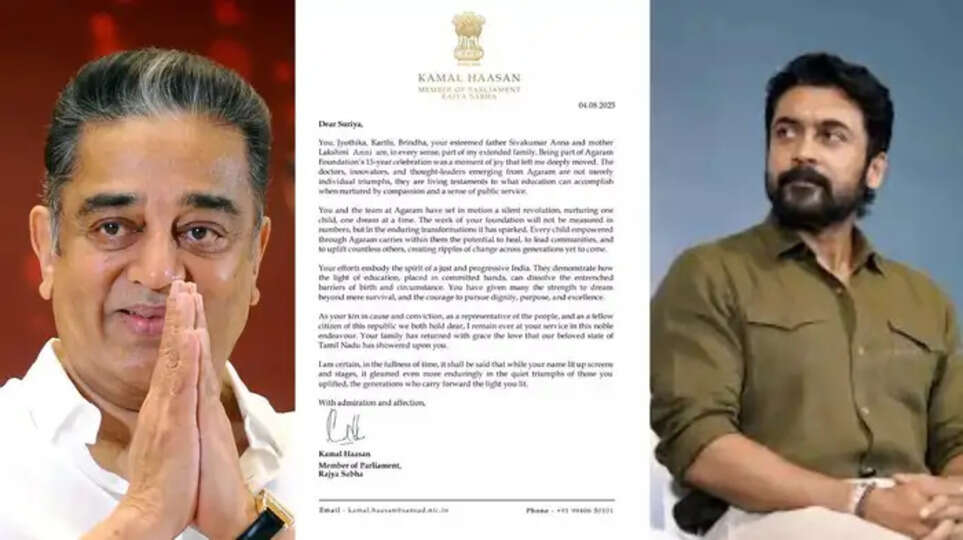 நடிகர் சூர்யாவுக்கு கமல் ஹாசன் வாழ்த்து கடிதம் ஒன்றை அனுப்பி உள்ளார். அந்த கடிதத்தில், அன்புள்ள சூர்யாவுக்கு, நீங்கள், உங்கள் வாழ்க்கை துணை ஜோதிகா, சகோதரர் கார்த்தி, உங்களின் மதிப்பிற்குரிய தந்தை சிவகுமார், தாய் லட்சுமி மற்றும் உங்களின் குடும்ப உறுப்பினர்கள் அனைவரும் என் இதயத்திற்கும், என் பெரிய குடும்பத்திற்கும் மிக முக்கியமான பகுதிகள். உங்களின் மனிதாபிமான பணி, கலையும் சமூக சேவையும் இணைந்து செய்வது இன்று மிகச் சிலரால் மட்டுமே இயல்கின்ற செயல் ஆகும்.