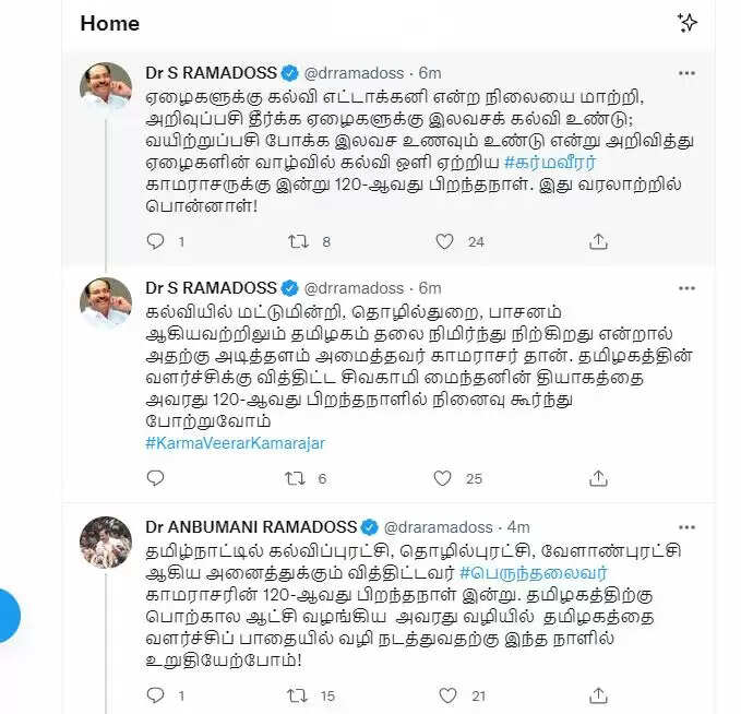 இந்நிலையில் பாமக நிறுவனர் ராமதாஸ், "ஏழைகளுக்கு கல்வி எட்டாக்கனி என்ற நிலையை மாற்றி, அறிவுப்பசி தீர்க்க ஏழைகளுக்கு இலவசக் கல்வி உண்டு; வயிற்றுப்பசி போக்க இலவச உணவும் உண்டு என்று அறிவித்து ஏழைகளின் வாழ்வில் கல்வி ஒளி ஏற்றிய #கர்மவீரர் காமராசருக்கு இன்று 120-ஆவது பிறந்தநாள். இது வரலாற்றில் பொன்னாள்!கல்வியில் மட்டுமின்றி, தொழில்துறை, பாசனம் ஆகியவற்றிலும் தமிழகம் தலை நிமிர்ந்து நிற்கிறது என்றால் அதற்கு அடித்தளம் அமைத்தவர் காமராசர் தான். தமிழகத்தின் வளர்ச்சிக்கு வித்திட்ட சிவகாமி மைந்தனின் தியாகத்தை அவரது 120-ஆவது பிறந்தநாளில் நினைவு கூர்ந்து போற்றுவோம்" என்று குறிப்பிட்டுள்ளார்.