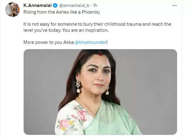 குஷ்புவுக்கு நேர்ந்த பாலியல் துன்புறுத்தல்தான் இன்று பெரும்பாலான ஊடகங்களில் விவாத பொருளாகி இருக்கிறது. இந்த மாதிரி சிக்கல் எல்லாம் இருந்தாலும் அவற்றை எல்லாம் சமாளித்து மேலே வந்திருக்கும் குஷ்புவை பார்த்து வியக்கிறார் தமிழக பாஜக தலைவர் அண்ணாமலை. சாம்பலில் இருந்து உயிர்த்தெழுந்து வந்த பீனிக்ஸ் பறவை என்று நெகிழ்கிறார்.