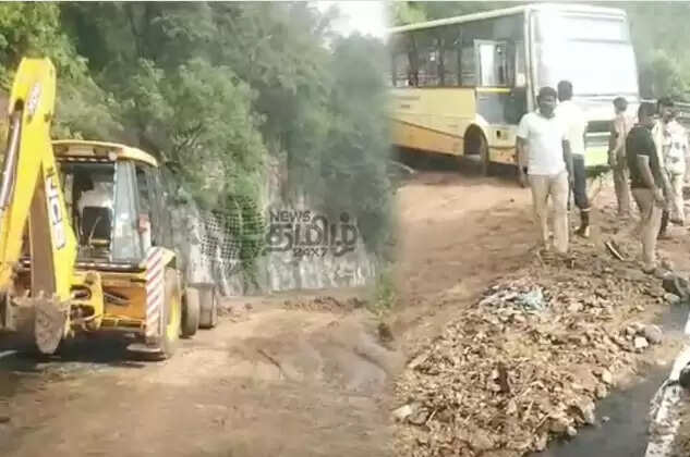 ஈரோடு மாவட்டம் திம்பம் மலைப்பாதையின் 20-வது கொண்டை ஊசி வளைவில் மண் சரிவு ஏற்பட்டதால் தமிழ்நாடு-கர்நாடகா இடையே போக்குவரத்து துண்டிக்கப்பட்டது.