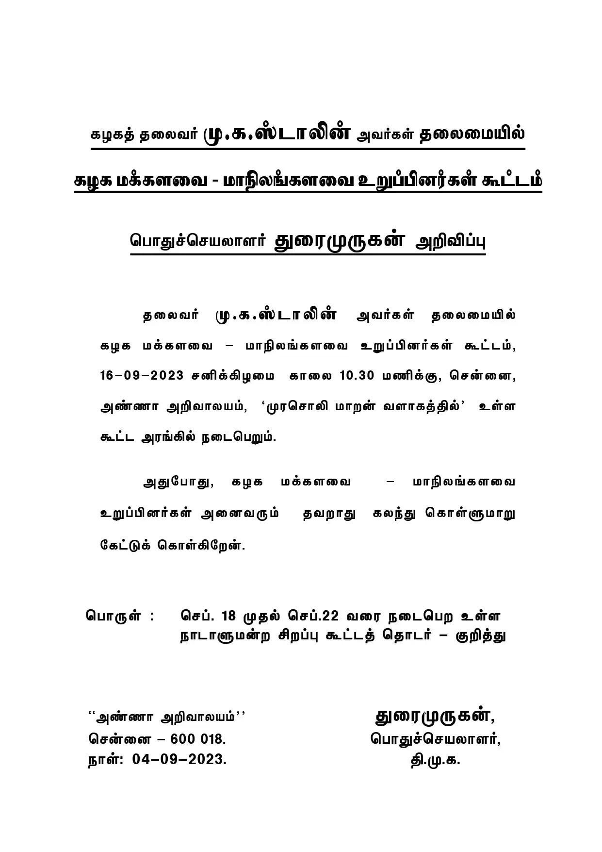 இதுதொடர்பாக அமைச்சரும், திமுக பொதுச்செயலாளருமான துரைமுருகன் வெளியிட்டுள்ள செய்திக்குறிப்பில்,செப். 18 முதல் செப்.22 வரை நடைபெற உள்ள நாடாளுமன்ற சிறப்பு கூட்டத் தொடர் - குறித்து தலைவர் மு.க.ஸ்டாலின் அவர்கள் தலைமையில் கழக மக்களவை மாநிலங்களவை உறுப்பினர்கள் கூட்டம், 16-09-2023 சனிக்கிழமை காலை 10.30 மணிக்கு, சென்னை, அண்ணா அறிவாலயம், 'முரசொலி மாறன் வளாகத்தில்' உள்ள கூட்ட அரங்கில் நடைபெறும்.