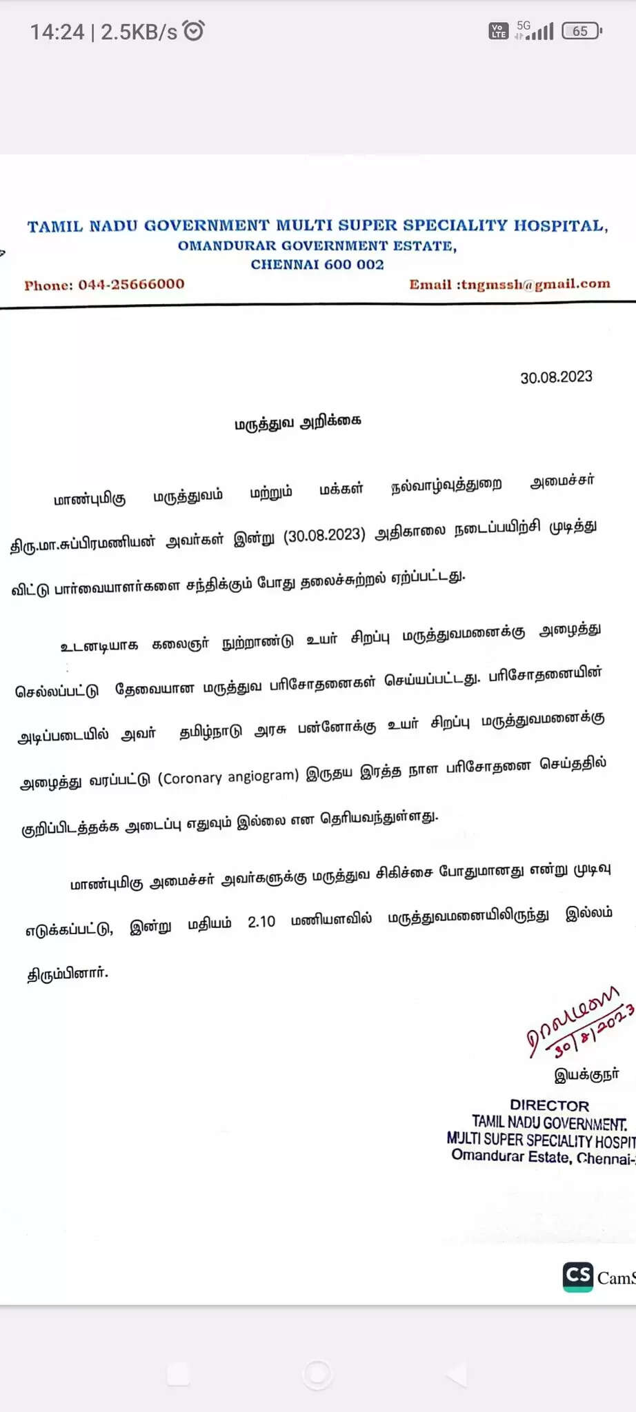 பரிசோதனையின் அடிப்படையில் அவர் தமிழ்நாடு அரசு பன்னோக்கு உயர் சிறப்பு மருத்துவமனைக்கு அழைத்து வரப்பட்டு (Coronary angiogram) இருதய இரத்த நாள பரிசோதனை செய்ததில் குறிப்பிடத்தக்க அடைப்பு எதுவும் இல்லை என தெரியவந்துள்ளது.