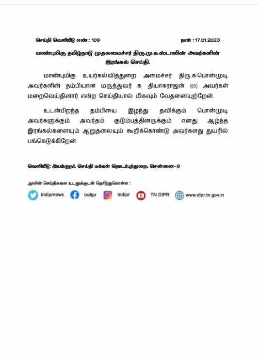 இந்நிலையில் தமிழக முதல்வர் ஸ்டாலின் வெளியிட்டுள்ள இரங்கல் குறிப்பில் , "மாண்புமிகு உயர்கல்வித்துறை அமைச்சர் திரு.க.பொன்முடி அவர்களின் தம்பியான மருத்துவர் க. தியாகராஜன் (65) அவர்கள் மறைவெய்தினார் என்ற செய்தியால் மிகவும் வேதனையுற்றேன், உடன்பிறந்த தம்பியை இழந்து தவிக்கும் பொன்முடி அவர்களுக்கும் அவர்தம் குடும்பத்தினருக்கும் எனது ஆழ்ந்த இரங்கல்களையும் ஆறுதலையும் கூறிக்கொண்டு அவர்களது துயரில் பங்கெடுக்கிறேன்" என்று குறிப்பிட்டுள்ளார்.