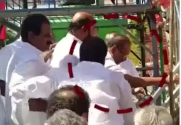 மாவட்ட செயலாளர் காலில் #அமைச்சர் ரகுபதி விழுந்ததால் பரபரப்பு pic.twitter.com/YfUdHL8mT1