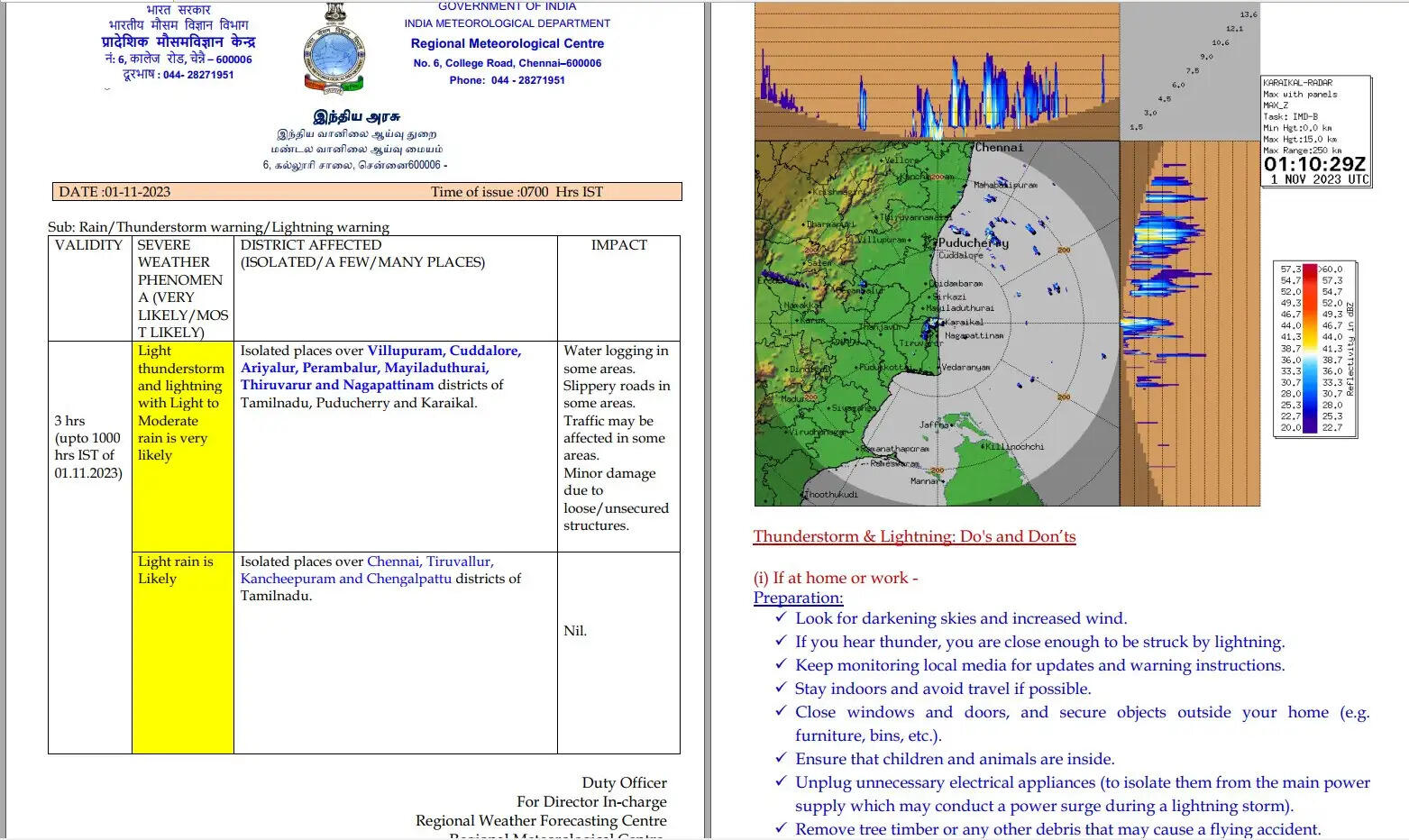 தென்மேற்கு வங்க கடல் பகுதிகளில் ஒரு வளிமண்டல கீழடுக்கு சுழற்சி நிலவுகிறது. இதன் காரணமாக இன்றும் , நாளையும் தமிழ்நாடு, புதுச்சேரி மற்றும் காரைக்கால் பகுதிகளில் ஒருசில இடங்களில் இடி மின்னலுடன் கூடிய லேசானது முதல் மிதமான மழை பெய்யக்கூடும் என்று வானிலை ஆய்வு மையம் தெரிவித்திருந்தது. .