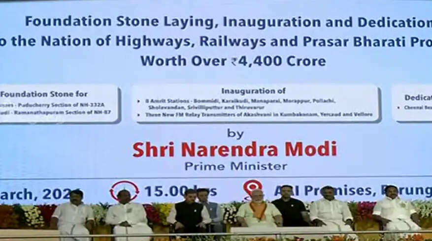 மதுரையில் நடைபெறும் அரசு நிகழ்ச்சியில் ரூ.4,400 கோடி திட்டங்களை பிரதமர் மோடி தொடங்கிவைத்தார். கும்பகோணம், வேலூர், ஏற்காடு உள்ளிட்ட இடங்களில் ஆகாஷ்வாணி பண்பலையையும் தொடங்கிவைத்தார். மேலும் மறுசீரமைக்கப்பட்ட காரைக்குடி, மொரப்பூர், ஸ்ரீவில்லிபுத்தூர், பொள்ளாச்சி, சோழவந்தான் உள்ளிட்ட 8 ரயில் நிலையங்களை திறந்து, சென்னை கடற்கரை, எழும்பூர் 4வது பாதையை மோடி அர்ப்பணித்தார். மேலும் மரக்காணம்- புதுச்சேரி, பரமக்குடி- ராமநாதபுரம் 4 வழிச்சாலைக்கும் பிரதமர் மோடி அடிக்கல் நாட்டினார்.