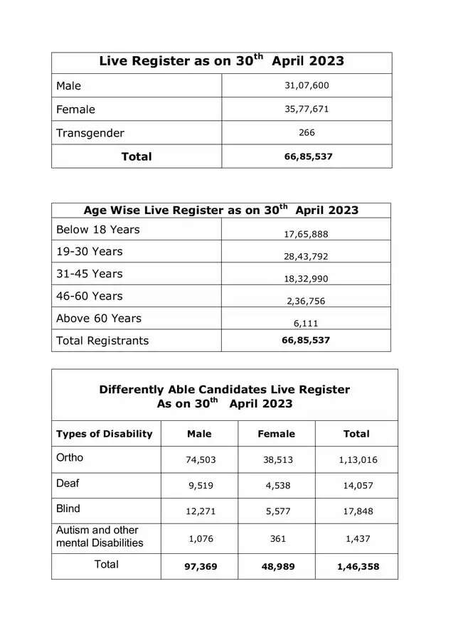 அத்துடன் மாற்றுத்திறனாளிகள் ஒரு லட்சத்து 46 ஆயிரத்து 358 பேர் வேலை வாய்ப்புக்காக பதிவு செய்துள்ளதாக தெரிவிக்கப்பட்டுள்ளது .இதில் 97 ஆயிரத்து 369 ஆண்களும் 48,989 பெண்களும் அடங்குவர்.
