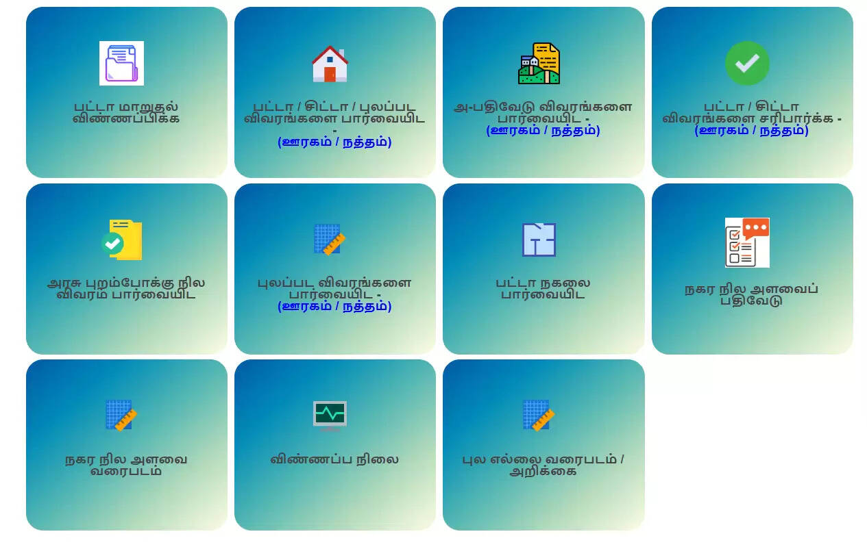தமிழகத்தில் கிராமம் மற்றும் நகர்புறங்களில் பல்வகையான நில ஆவணங்கள் கணினிப்படுத்தப்பட்டு இணையவழியில் பராமரிக்கப்பட்டு வருகின்றன. குறிப்பாக, நில உரிமைதாரர்கள் பயனடையும் வகையில் பல்வேறு இணையவழிச்சேவைகள் நிலஅளவை மற்றும் நிலவரித்திட்டத் துறையால் பொதுமக்களுக்கு அளிக்கப்பட்டு வருகின்றன. இதில் குறிப்பாக, எங்கிருந்தும் எந்நேரத்திலும் என்ற இணையவழிச் சேவையை (https://eservices.tn.gov.in) பயன்படுத்தி, கிராமப்புற மற்றும் நத்தம் நில ஆவணங்களின் பட்டா, சிட்டா, 'அ' பதிவேடு மற்றும் புலப்படம் ஆகியவற்றையும், நகர்ப்புற நிலஅளவைப் பதிவேட்டின் நகல், நகர நிலஅளவை வரைபடம் மற்றும் புல எல்லை வரைபடம் / அறிக்கை ஆகியவற்றையும் பதிவிறக்கம் செய்து கொள்ளலாம். பட்டா மாற்றத்திற்கு அளித்த விண்ணப்பத்தின் நிலையையும் அறிந்து கொள்ளலாம்.