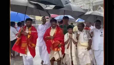 திருப்பதி ஏழுமலையான் கோயிலில் கொட்டும் மழையில் குடை பிடித்தபடி சென்று முன்னாள் முதல்வர் பன்னீர்செல்வம் சாமி தரிசனம் செய்தார்.