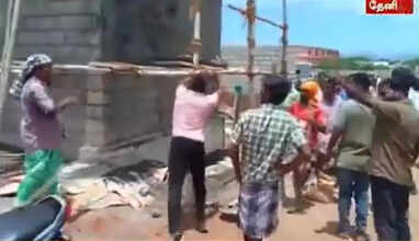 தேனியில் பஞ்சமி நிலத்தை ஆக்கிரமித்ததாக கூறி கட்டிடங்களை கல்லாலும், கட்டைகளாலும் இடித்த நபர்களால் பரபரப்பு ஏற்பட்டது.