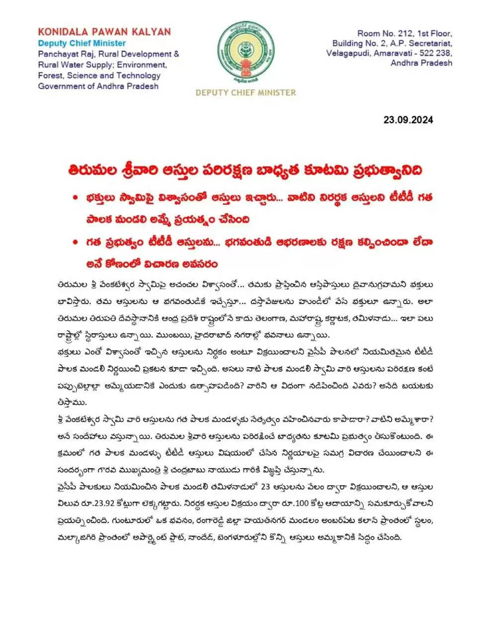 வெங்கடேஸ்வர சுவாமியின் சொத்துக்களை முந்தைய அறங்காவலர் குழுவுக்கு தலைமை தாங்கியவர்கள் பாதுகாத்தார்களா? அவற்றை விற்றார்களா? என்ற சந்தேகம் வருகிறது. சொத்துக்களைப் பாதுகாக்கும் பொறுப்பை கூட்டணி அரசு ஏற்கும். எனவே இதற்காக தேவஸ்தான சொத்துகள் தொடர்பாக முந்தைய ஆட்சியின் எடுத்த முடிவுகள் குறித்து விரிவான விசாரணை நடத்துமாறு முதலமைச்சர் சந்திரபாபு நாயுடு அவர்களிடம் வேண்டுகோள் விடுக்கிறேன். ஒய்.எஸ்.ஆர். காங்கிரஸ் ஆட்சியாளர்களால் நியமிக்கப்பட்ட குழு தமிழகத்தில் உள்ள 23 சொத்துக்களை ஏலம் மூலம் விற்க முடிவு செய்து, அவற்றின் மதிப்பு ₹.23.92 கோடி என கணக்கிடப்பட்டுள்ளது. பயன்படாத சொத்துகளை விற்று ரூ.100 கோடி வருமானம் ஈட்ட முயற்சித்துள்ளது. அவ்வாறு குண்டூரில் ஒரு கட்டிடம், தெலங்கானா மாநிலம் ரங்காரெட்டி மாவட்டம் ஹயத்நகர் மண்டலத்தின் அம்பர்பேட்டா கலான் பகுதியில் உள்ள நிலம், மல்காஜிகிரி பகுதியில் அடுக்குமாடி குடியிருப்பு, பெங்களூரு, நாந்தேட்டில் சில சொத்துக்கள் விற்பனை செய்ய முயன்றதாக துணை முதல்வர் பவன் கல்யாண் வெளியிட்டுள்ள அறிக்கையில் தெரிவித்துள்ளார்.
