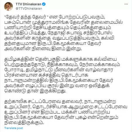 பி.கே.மூக்கையா தேவரின் புகழ் என்றென்றும் நிலைத்திருக்கும் என்று தினகரன் தெரிவித்துள்ளார்.