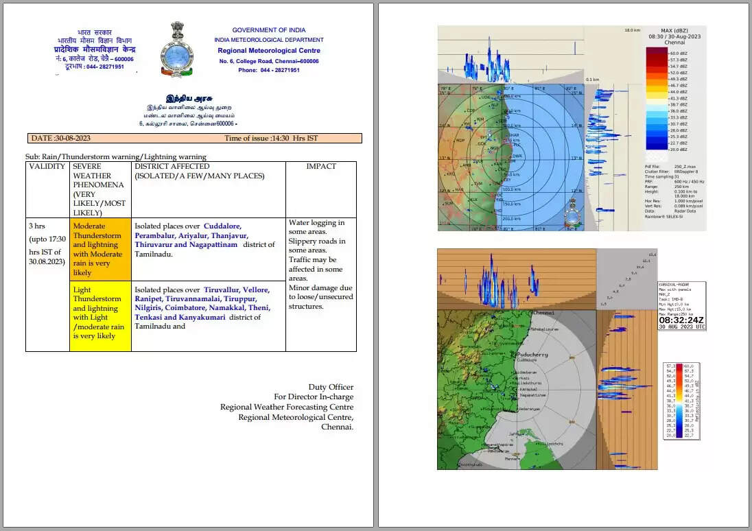தமிழக பகுதிகளின் மேல் நிலவும் வளிமண்டல கீழடுக்கு சுழற்சி காரணமாக,30.08.2023: தமிழ்நாடு, புதுச்சேரி மற்றும் காரைக்கால் பகுதிகளில் ஒருசில இடங்களில் இடி மின்னலுடன் கூடிய லேசானது முதல் மிதமான மழை பெய்யக்கூடும். கோயம்புத்தூர் மாவட்டத்தின் மலை பகுதிகள், திருப்பூர், தேனி, திண்டுக்கல், மதுரை, சிவகங்கை, வேலூர், திருப்பத்தூர், தர்மபுரி, சேலம் மற்றும் திருச்சிராப்பள்ளி மாவட்டங்களில் ஓரிரு இடங்களில் கனமழை பெய்யவாய்ப்புள்ளது.