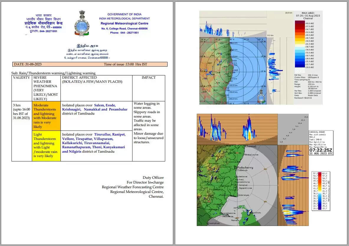 தமிழ்நாடு, புதுச்சேரி மற்றும் காரைக்கால் பகுதிகளில் இன்று ஒருசில இடங்களில் இடி மின்னலுடன் கூடிய லேசானது முதல் மிதமான மழை பெய்யக்கூடும். விழுப்புரம், கள்ளக்குறிச்சி, பெரம்பலூர் மற்றும் திருவண்ணாமலை மாவட்டங்களில் ஓரிரு இடங்களில் கன முதல் மிக கனமழையும், அரியலூர், கடலூர், சேலம், நாமக்கல், கரூர், திண்டுக்கல், தேனி, தென்காசி, திருச்சிராப்பள்ளி, நீலகிரி மாவட்டங்கள் மற்றும் புதுச்சேரியில் ஓரிரு இடங்களில் கனமழையும் பெய்யவாய்ப்புள்ளது.