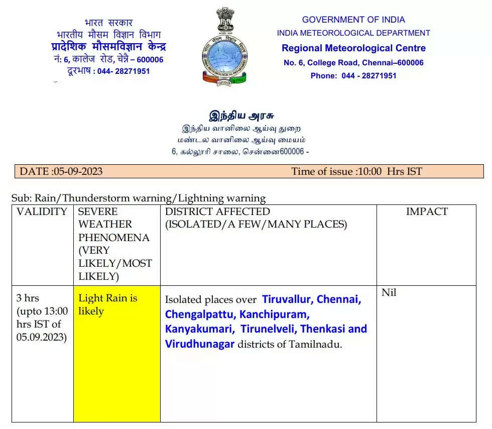 இந்நிலையில் மதியம் ஒரு மணி வரை திருவள்ளூர் ,சென்னை, செங்கல்பட்டு, காஞ்சிபுரம், கன்னியாகுமரி, திருநெல்வேலி, தென்காசி, விருதுநகர் ஆகிய 8 மாவட்டங்களில் லேசான மழைக்கு வாய்ப்பு இருப்பதாக வானிலை ஆய்வு மையம் தெரிவித்துள்ளது.