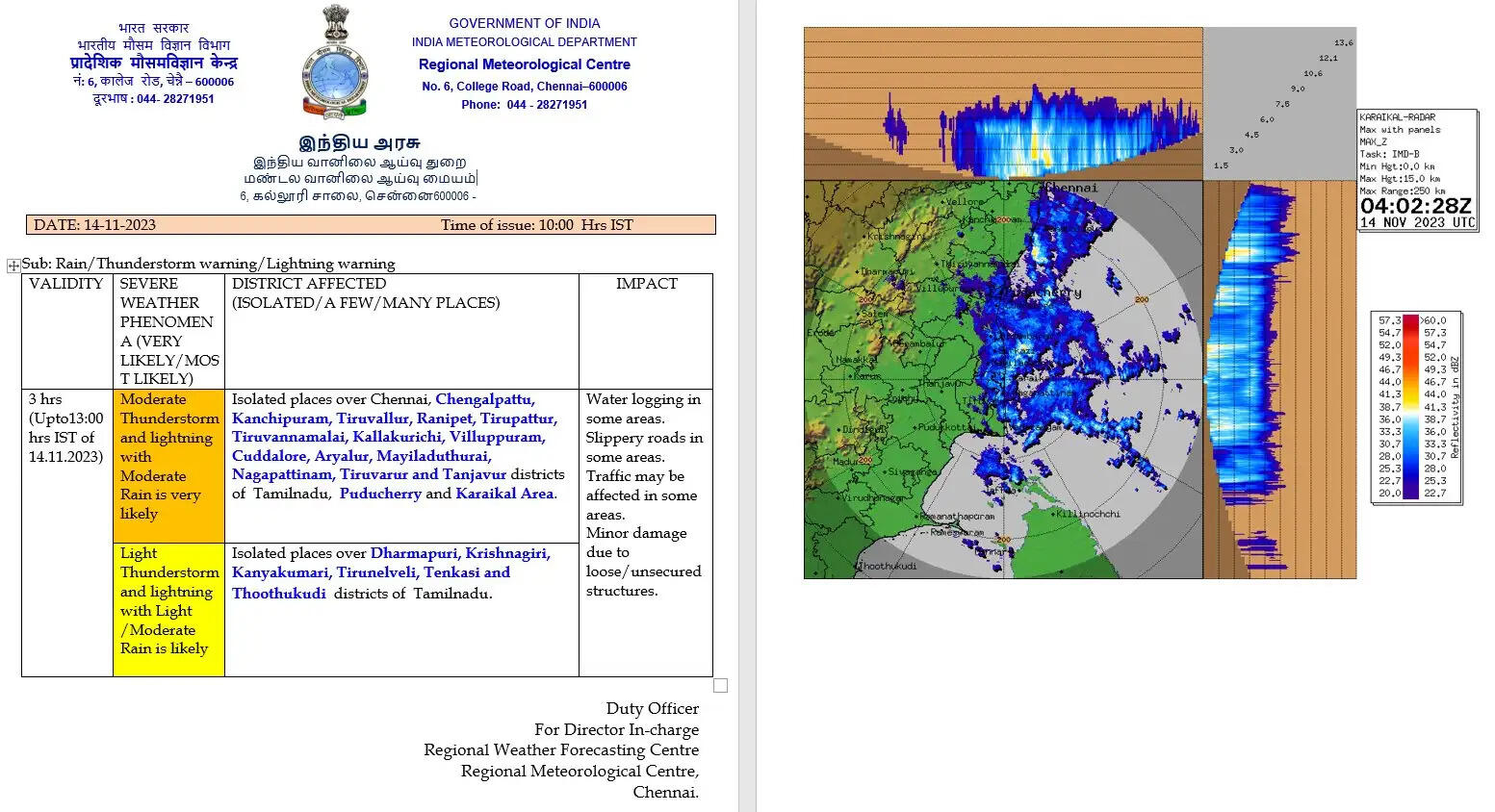 இந்நிலையில் தமிழ்நாட்டில் மதியம் ஒரு மணி வரை சென்னை, செங்கல்பட்டு, காஞ்சிபுரம், திருவள்ளூர், ராணிப்பேட்டை, திருப்பத்தூர், திருவண்ணாமலை, கள்ளக்குறிச்சி, விழுப்புரம், கடலூர், அரியலூர், மயிலாடுதுறை, நாகப்பட்டினம், திருவாரூர், தஞ்சாவூர் ஆகிய மாவட்டங்களில் இடி மின்னலுடன் கூடிய மிதமான மழை பெய்யக்கூடும் என்றும், தர்மபுரி, கிருஷ்ணகிரி, கன்னியாகுமரி, திருநெல்வேலி, தென்காசி மற்றும் தூத்துக்குடி ஆகிய மாவட்டங்களில் இடி மின்னலுடன் கூடிய லேசானது முதல் மிதமான மழை பெய்யக்கூடும் என்று வானிலை ஆய்வு மையம் தெரிவித்துள்ளது.
