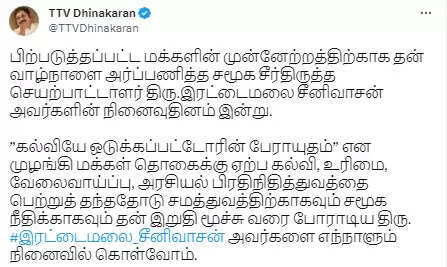 இரட்டைமலை சீனிவாசனை எந்நாளும் நினைவில் கொள்வோம் என்று தினகரன் தெரிவித்துள்ளார்.