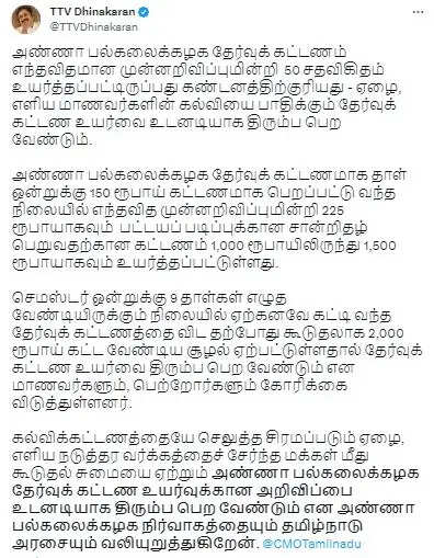 அண்ணா பல்கலைக்கழகத்தின் தேர்வுக் கட்டண உயர்வை திரும்ப பெற வேண்டும் என்று தினகரன் வலியுறுத்தியுள்ளார்.