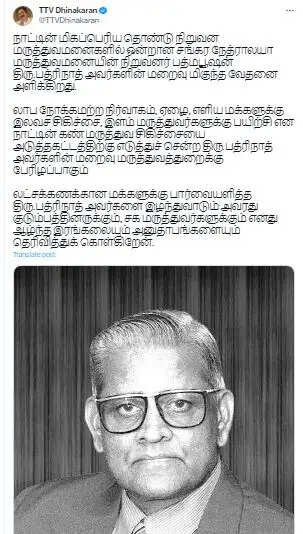 நாட்டின் மிகப்பெரிய தொண்டு நிறுவன மருத்துவமனைகளில் ஒன்றான சங்கர நேத்ராலயா மருத்துவமனையின் நிறுவனர் பத்மபூஷன் பத்ரிநாத் அவர்களின் மறைவு மிகுந்த வேதனை அளிக்கிறது என்று தினகரன் தெரிவித்துள்ளார்.