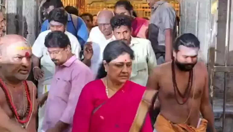 திருவண்ணாமலை அண்ணாமலையார் கோவிலில் இன்று மாலை வி.கே.சசிகலா சாமி தரிசனம் செய்தார். அப்போது அவர் கோவிலில் உள்ள சம்பந்த விநாயகர் சன்னதியில் வழிபாடு செய்து விட்டு அண்ணாமலையார் மற்றும் உண்ணாமுலையம்மன் சன்னதியில் நடைபெற்ற அபிஷேகத்தில் கலந்து கொண்டு சாமி தரிசனம் செய்தார். இதனை தொடர்ந்து கிரிவலப் பாதையில் உள்ள குபேர லிங்கத்திற்கு வருகை தந்த அவர் குபேரலிங்க கருவறை அர்த்தமண்டபத்திற்கு சென்று சிறப்பு தரிசனம் செய்தார். பின்னர் கோவிலில் சாமி தரிசனம் செய்ய வந்த ஆன்மீக பக்தர்களிடம் நின்று செல்பி மற்றும் புகைப்படங்களை எடுத்துக் கொண்டார்.