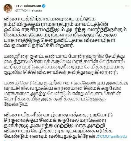 விவசாயிகளின் வாழ்வாதாரத்தை அடியோடு சீர்குலைக்கும் சீமைக் கருவேல மரங்களை தனிக்குழு அமைத்து முற்றிலுமாக அகற்றி விவசாயம் செழிக்க அரசு நடவடிக்கை எடுக்க வேண்டும் எனவும் வலியுறுத்துகிறேன்." என்று குறிப்பிட்டுள்ளார்.