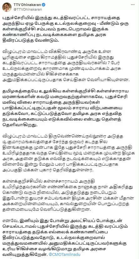 மீண்டும் ஒரு கள்ளக்குறிச்சி சம்பவம் நடைபெறாமல் இருக்க கண்காணிப்பு நடவடிக்கைகளை தமிழக அரசு தீவிரப்படுத்த வேண்டும் என்று தினகரன் வலியுறுத்தியுள்ளார்.