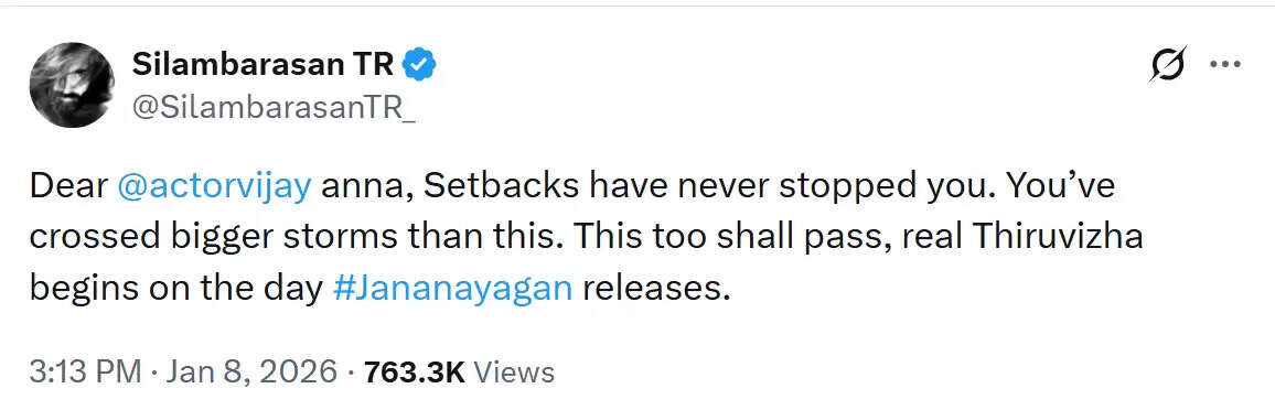 இந்நிலையில் நடிகர் சிம்பு தனது எக்ஸ் தளத்தில், “விஜய் அண்ணா, முட்டௌக்கட்டைகள் உங்கள் ஓட்டத்தை ஒருபோதும் தடுத்ததில்லை. இதைவிட பெரிய புயல்களை எல்லாம் நீங்கள் கடந்துவிட்டீர்கள். இதுவும் கடந்து போகும். ஜனநாயகன் வெளியாகும் நாளில் தான் உண்மையான திருவிழா தொடங்கும்” எனக் குறிப்பிட்டுள்ளார்.