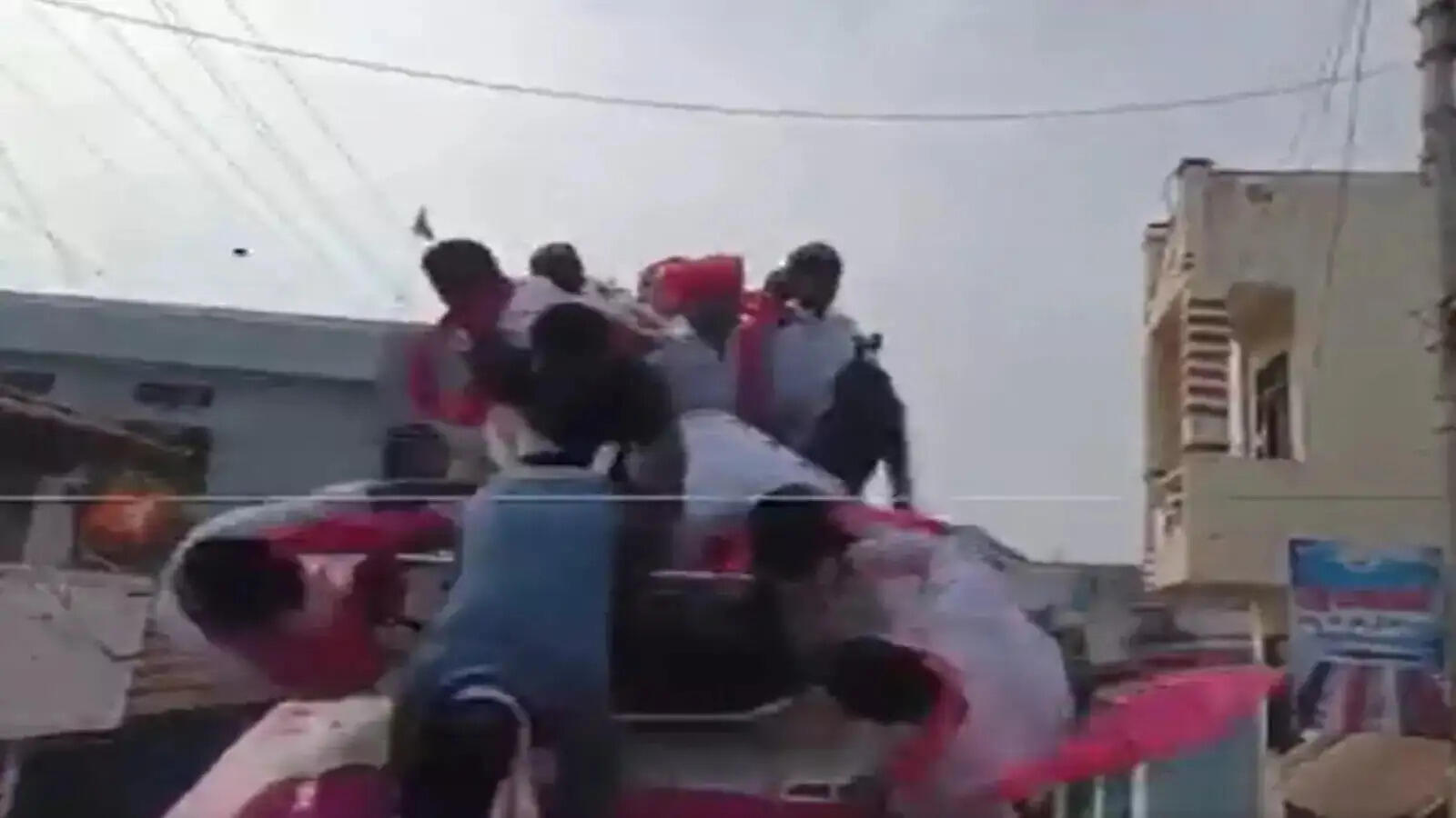 தெலுங்கானா மாநிலம் நிஜாமாபாத்தில் ரோட் ஷோவில் வாகனத்தின் மீது நின்று சென்றபோது அமைச்சர் கே.டி.ஆர் தவறி விழுந்தார்.