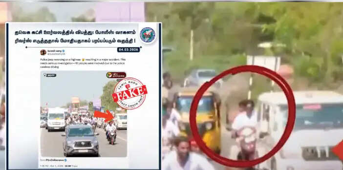 தஞ்சையில் தவெக கட்சி தலைவர் விஜய்யை பின்தொடர்ந்த வாகனம் விபத்துக்குள்ளானதுக்கு காரணம் போலீஸ் வாகனம் ரிவர்ஸ் எடுத்ததே என்று சமூக வலைத்தளங்களில் வதந்தி பரப்பப்படுகிறது. இதுதொடர்பாக பரப்பப்பபடும் வீடியோவில் இருசக்கர வாகனத்தில் வரும் நபர்கள், விஜயை பார்த்துக் கொண்டு முன்னால் இருந்த வாகனத்தை பார்க்காமல் செல்கின்றனர். அதில், ஒரு இரு சக்கர வாகனம் போலீஸ் வாகனம் அருகில் வந்து இடிக்காமல் தப்பித்து நகர்ந்து செல்கிறது. ஆனால், மற்றொருவர் போலீஸ் வாகனத்தை பார்க்காமல் இடித்ததில் விபத்து ஏற்பட்டு இருக்கிறது.