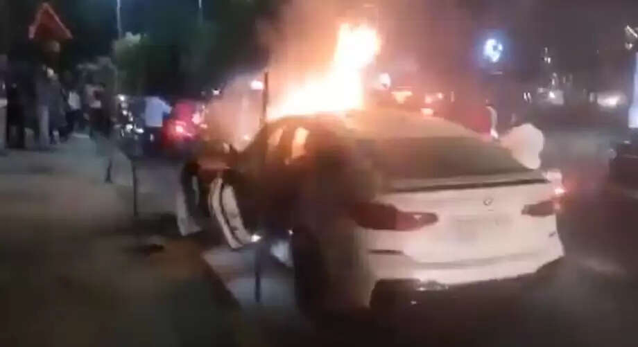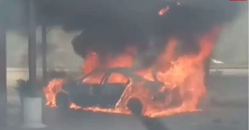 சாலையோரம் காரை நிறுத்தி கடையில் டீ குடித்த போது தீப்பிடித்து எரிந்த கார்