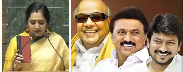 மறைந்த முன்னாள் முதல்வர் கருணாநிதி, முதல்வர் மு.க.ஸ்டாலின் பெயர்களை குறிப்பிட்டு மக்களவையில் திமுக எம்பிக்கள் பதவியேற்றனர். அப்போது ‘வருங்காலம் எங்கள் உதயநிதி்’ எனவும் கூறி திமுக எம்பிக்கள் சிலர் பதவியேற்றனர்.