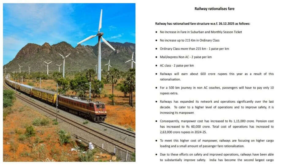 அனைத்து ஏசி வகுப்புகளுக்கும் 1 கிலோமீட்டருக்கு 2 பைசா கட்டணம் உயர்த்தப்பட்டுள்ளது.