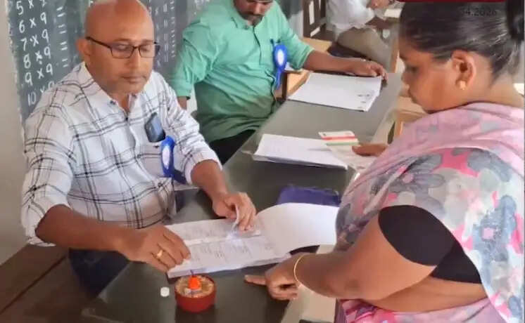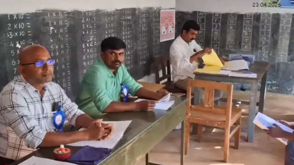 ஒருவரை எதிர்பார்த்து காத்திருக்கும் வாக்குப்பதிவு நடத்தும் குழுவினர்
