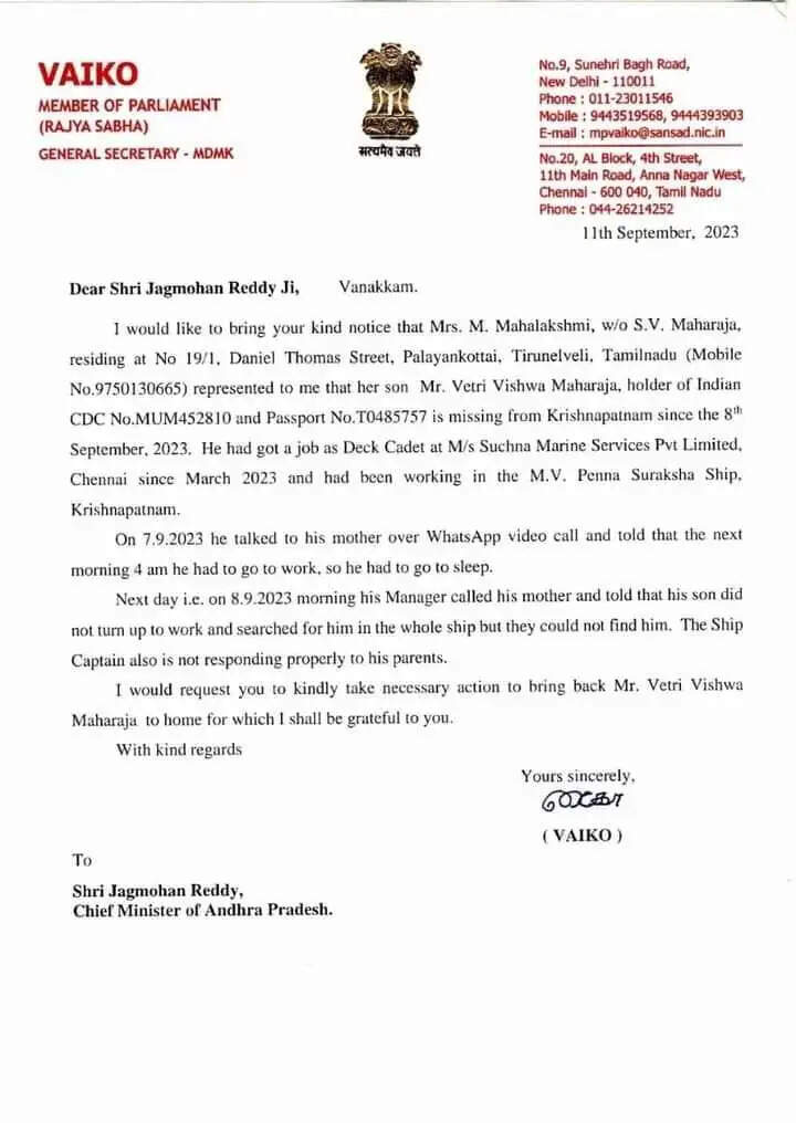 இது தொடர்பாக ஆந்திர முதல்வர் ஜெகன் மோகன் ரெட்டிக்கு மதிமுக பொதுச்செயலாளரும், எம்.பி.யுமான வைகோ எழுதியுள்ள கடிதத்தில் , "தமிழ்நாடு, திருநெல்வேலி மாவட்டம் பாளையங்கோட்டை டேனியல் தாமஸ் தெருவில் வசிக்கும் மகாலெட்சுமி மற்றும் மகாராஜா ஆகியோரின் மகன் திரு. ம. வெற்றி விசுவா என்பவர் சென்னையில் உள்ள SUCHNA MARINE SERVICES PVT LTD என்ற கப்பல் நிறுவனத்தில் DECK CADET ஆக பணிக்கு சேர்ந்து ஆந்திர மாநிலம்,