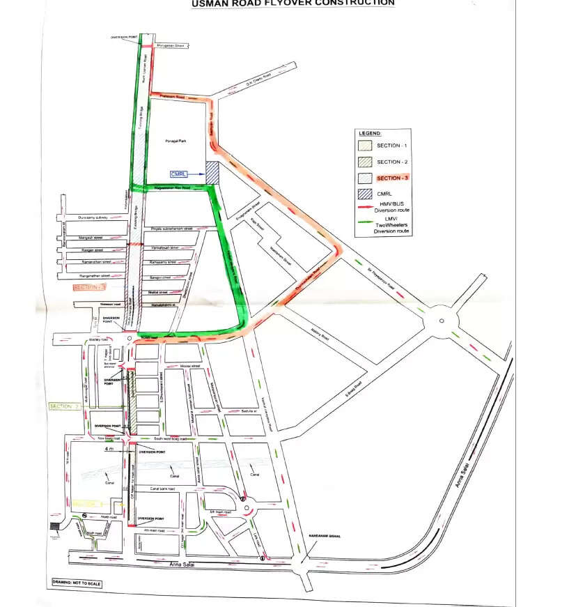 - வடக்கு உஸ்மான் சாலையில் இருந்து தி.நகர் பேருந்து நிலையம் நோக்கி வரும் வாகனங்கள் பனகல் பார்க் அருகில் உள்ள உஸ்மான் சாலை மேம்பாலத்தில் செல்ல தடைசெய்யப்பட்டுள்ளது. அதற்கு பதிலாக வாகனங்கள் மேம்பாலத்தின் அனுகு (சர்வீஸ்) சாலை வழியாக சென்று பிரகாசம் சாலை, பாஷ்யம் சாலை, தியாகராய சாலை, பர்கிட் சாலை வழியாக தி.நகர் பேருந்து நிலையத்தை அடையலாம்.