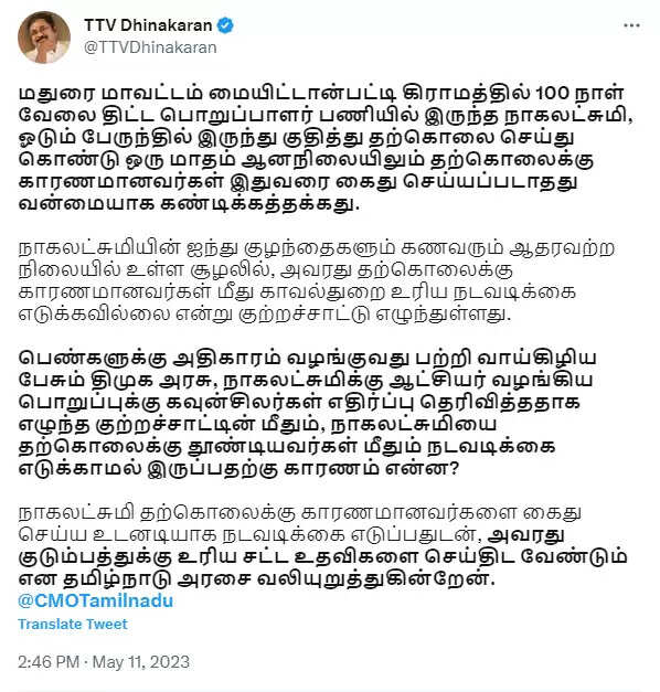 இந்நிலையில் அம்மா மக்கள் முன்னேற்ற கழகத்தின் பொதுச்செயலாளர் டிடிவி தினகரன் தனது ட்விட்டர் பக்கத்தில், "மதுரை மாவட்டம் மையிட்டான்பட்டி கிராமத்தில் 100 நாள் வேலை திட்ட பொறுப்பாளர் பணியில் இருந்த நாகலட்சுமி, ஓடும் பேருந்தில் இருந்து குதித்து தற்கொலை செய்து கொண்டு ஒரு மாதம் ஆனநிலையிலும் தற்கொலைக்கு காரணமானவர்கள் இதுவரை கைது செய்யப்படாதது வன்மையாக கண்டிக்கத்தக்கது.