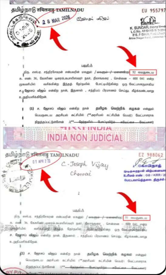 இந்நிலையில் பெரம்பூர் மற்றும் திருச்சி கிழக்கு ஆகிய தொகுதிகளில் போட்டியிட மனுதாக்கல் செய்த தவெக தலைவர் விஜய், இரு மனுக்களிலும் வயதை வெவ்வேறாக குறிப்பிட்டிருப்பதால் குழப்பம் நிலவுகிறது. பெரம்பூர் தொகுதியில் தாக்கல் செய்த மனுவில் தனது வயதை 52 என குறிப்பிட்டிருந்த விஜய், 3 நாட்களுக்குப் பின் திருச்சியில் தாக்கல் செய்த மனுவில் தனது வயதை 51 என குறிப்பிட்டுள்ளார். ஏற்கெனவே ஒரு மனுவில் தன் மீது வழக்கு ஏதும் இல்லை எனவும், ஒரு மனுவில் வழக்குகள் நிலுவையில் இருப்பதாகவும் விஜய் குறிப்பிட்டிருந்தது பேசுபொருளானது.