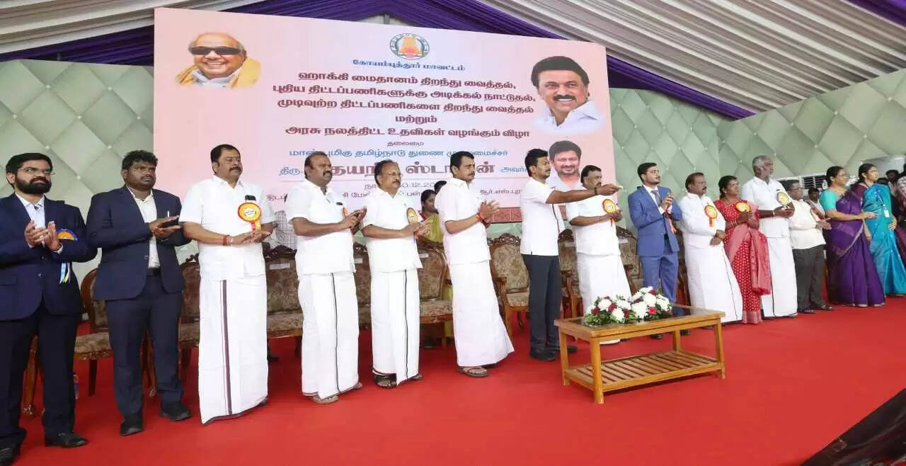 இன்று இன்னொரு முக்கியமான விஷயம், கடந்த சட்டமன்றக் கூட்டத்தொடரில் முதலமைச்சர் அவர்கள் அறிவித்தார். கல்லூரி மாணவ மாணவிகளின் கல்விக்குத் துணை நிற்கின்ற வகையில், இன்னும் சில நாட்களில் இந்த வருடம் மட்டும் 10 லட்சம் அதிநவீன மடிக்கணினிகள் மாணவர்களுக்கு வழங்க இருக்கிறோம். இதை மாணவர்கள் சிறப்பாகப் பயன்படுத்திக்கொள்ள என் வாழ்த்துகளைத் தெரிவித்துக் கொள்கிறேன். இவை எல்லாவற்றிற்கும் மேலாக இந்தியாவே திரும்பிப் பார்க்கின்ற ஒரு திட்டம், அதுதான் கலைஞர் மகளிர் உரிமைத் தொகைத் திட்டம். இன்று தமிழ்நாடு முழுவதும் ஒரு கோடியே 30 லட்சம் மகளிருக்கு மாதம் 1,000 ரூபாய் வழங்கப்பட்டு வருகிறது. இதுமட்டுமல்ல, இந்த கோவை மாவட்டத்திற்குத் தொடர்ந்து ஏராளமான நலத்திட்டங்களை நம்முடைய முதலமைச்சர் அவர்கள் அறிவித்துச் செயல்படுத்தியும் வருகிறார். சமீபத்தில் கோவைக்கு வந்த நம்முடைய முதலமைச்சர் அவர்கள் செம்மொழிப் பூங்காவைத் திறந்து வைத்துச் சிறப்பித்தார். நான் இன்று இங்கு வருவதற்கு முன்னால், கோவைக்கு நம்முடைய அரசின் புத்தாண்டுப் பரிசாக 10 கோடி ரூபாய் மதிப்பில் புதிய ஹாக்கி மைதானத்தைத் திறந்து வைத்திருக்கிறேன். இனி சர்வதேச மற்றும் தேசிய அளவிலான ஹாக்கிப் போட்டிகள் சென்னையில் மட்டுமல்ல, மதுரையில் மட்டுமல்ல, உங்களுடைய கோவையிலும் அடிக்கடி நடைபெறும் என்ற வாக்குறுதியை வழங்குகிறேன். கோவை சிங்காநல்லூர் ஒண்டிப்புதூர் எஸ்.ஐ.ஹெச்.எஸ் (SIHS) குடியிருப்புப் பகுதியில் உயர்மட்ட ரயில்வே மேம்பாலம் கட்ட 2010-ஆம் ஆண்டு கலைஞரின் ஆட்சிக் காலத்தில் அடிக்கல் நாட்டப்பட்டது. முந்தைய பத்தாண்டு ஆட்சி செய்தவர்கள், அந்த மேம்பாலப் பணியைக் கிடப்பில் போட்டுவிட்டார்கள். நம்முடைய அரசு சுமார் 56 கோடி ரூபாய் செலவில், இன்றைக்குக் கட்டி முடித்திருக்கிறது. அதையும் இன்று இந்த விழாவில், உங்கள் முன்னால் நான் திறந்து வைத்துள்ளேன். இந்த மேம்பாலம் மூலமாகச் சுமார் 42,000 கோவை மக்கள் பயன்பெற இருக்கிறார்கள். மேலும் கோவையில் 300 கோடி ரூபாய் மதிப்பீட்டில், தந்தை பெரியார் அறிவியல் மையத்திற்கான கட்டுமானப் பணிகள் நடைபெற்று வருகின்றன. கோவை மாநகராட்சி பகுதியில் 2,000 கோடி ரூபாய் மதிப்பில் பாதாளச் சாக்கடைப் பணிகள், 620 கோடி ரூபாய் மதிப்பீட்டில் 9,000 சாலைப் பணிகள் செய்யப்பட்டிருக்கின்றன. கோவை மாவட்டத்தில், இரண்டு முதலீட்டாளர் மாநாடுகளை நடத்தி சுமார் 7,100 கோடி ரூபாய் அளவிலான முதலீடுகளை நாம் ஈர்த்திருக்கிறோம்.