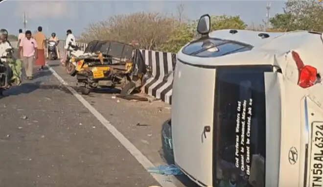 நாகமலை புதுக்கோட்டை பகுதியில் உள்ள காமராஜர் பல்கலைக்கழகத்தின் முன்புள்ள மேம்பாலத்தில் ஆட்டோ ஏறிச் சென்றபோது, பின்னால் சொகுசு கார் ஒன்று மின்னல் வேகத்தில் வந்துள்ளது. ஓட்டுநரின் கட்டுப்பாட்டை இழந்த அந்த கார், முன்னால் சென்ற ஆட்டோவின் பின்புறத்தில் பலமாக மோதியது. மோதிய வேகத்தில் ஆட்டோவும் காரும் நிலைதடுமாறி மேம்பாலத்திலேயே குப்புறக் கவிழ்ந்தன. இதில் ஆட்டோ முற்றிலும் நசுங்கி சுக்குநூறானது. ஆட்டோவில் இருந்தவர்கள் இடிபாடுகளுக்குள் சிக்கி அலறினர். இந்த விபத்தில் ஆட்டோவில் பயணித்த 6 பேர் மற்றும் காரில் இருந்தவர்கள் என மொத்தம் 9 பேருக்குத் தலை மற்றும் கை, கால்களில் பலத்த ரத்தக் காயம் ஏற்பட்டது. விபத்து நடந்தவுடன் அவ்வழியாகச் சென்ற வாகன ஓட்டிகள் உடனடியாக காயமடைந்தவர்களை மீட்டனர். தகவல் அறிந்து சம்பவ இடத்திற்கு விரைந்து வந்த 108 ஆம்புலன்ஸ் ஊழியர்கள், படுகாயமடைந்த அனைவரையும் மீட்டு மதுரை அரசு ராஜாஜி மருத்துவமனைக்குத் தீவிர சிகிச்சைக்காக அனுமதித்தனர் அங்கு அவர்களுக்கு அவசர சிகிச்சை பிரிவில் தீவிர சிகிச்சை அளிக்கப்பட்டு வருகிறது. இந்த விபத்து குறித்து நாகமலை புதுக்கோட்டை காவல்துறையினர் வழக்குப் பதிவு செய்துள்ளனர். அதிவேகமாக காரை ஓட்டி வந்ததே விபத்திற்குக் காரணமா அல்லது வேறு ஏதேனும் தொழில்நுட்பக் கோளாறா என்ற கோணத்தில் போலீசார் விசாரணை நடத்தி வருகின்றனர். பரபரப்பான மேம்பாலத்தில் நடந்த இந்த கோர விபத்து அப்பகுதியில் பெரும் சோகத்தையும், அதிர்ச்சியையும் ஏற்படுத்தியுள்ளது.