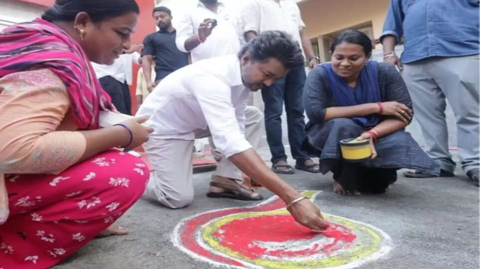 தவெக தலைவர் விஜய் தான் போட்டியிடும் சென்னை பெரம்பூர் தொகுதியில் வீடு வீடாக சென்று தீவிர வாக்கு சேகரிப்பில் ஈடுபட்டார். மேலும் விசில் கோலம் போட்டு விசில் சின்னத்தை கோலமாக வரைந்து பொதுமக்களிடம் விஜய் வாக்கு சேகரித்தார்.