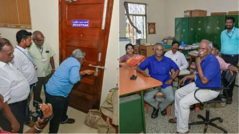 இந்நிலையில் நேற்று காலை பல்கலைக்கழகத்துக்கு வந்த, பதிவாளர் பொறுப்பாக இருந்த தியாகராஜன் அலுவலக வேலைக்கான சாவியை வழங்க மறுத்து, வேறொரு அறையில் அமர்ந்திருந்தார்.